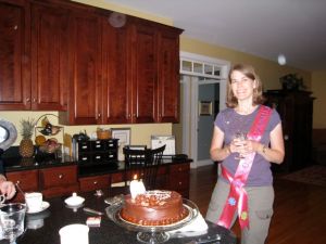 Here I am sporting a banner some friends made me — “Fabulous & Forty” – you should have seen the visor! And there is the world’s best ever chocolate chip cheesecake in front of me!