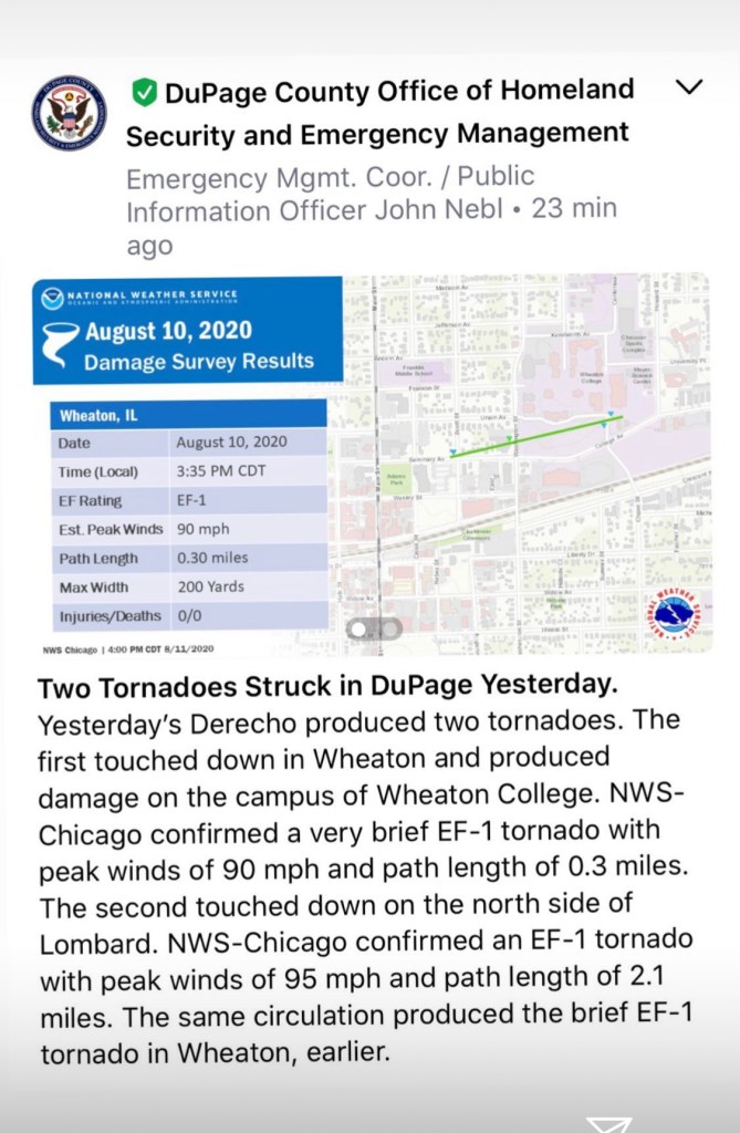 I was familiar with a derecho because one hit Memphis, where I grew up, in July 2003, in the early morning. My mom and step-dad couldn’t get out of the back of their house due to the downed trees, and they were without power for 15 days. The damage was incredible, with massive trees uprooted around town. It was likely much more similar to what we are seeing in Iowa now, as they still recover from this. Though it seems to be a rare weather occurrence, when one hits, it leaves its mark and is unforgettable.