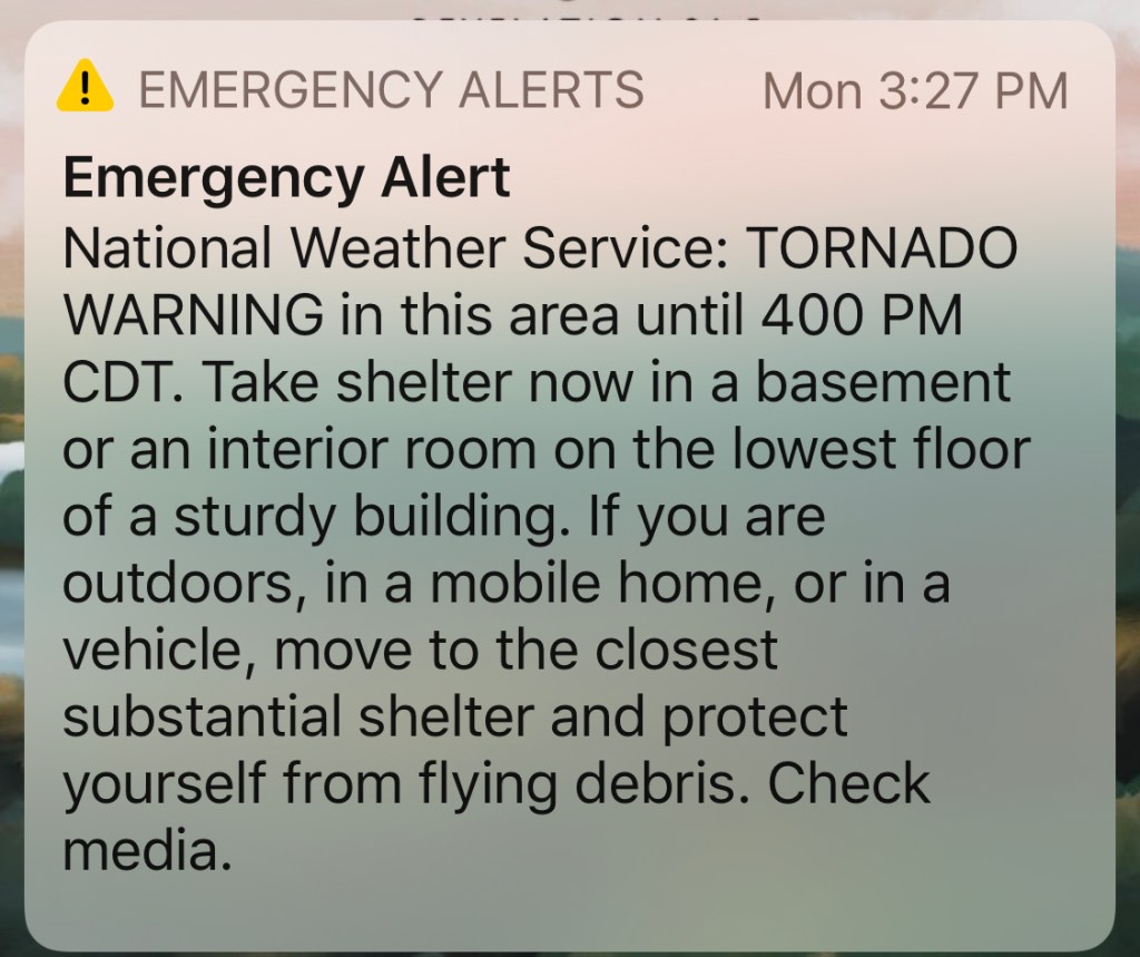 At 3:27 p.m., emergency alerts for a tornado warning came through all of our phones.