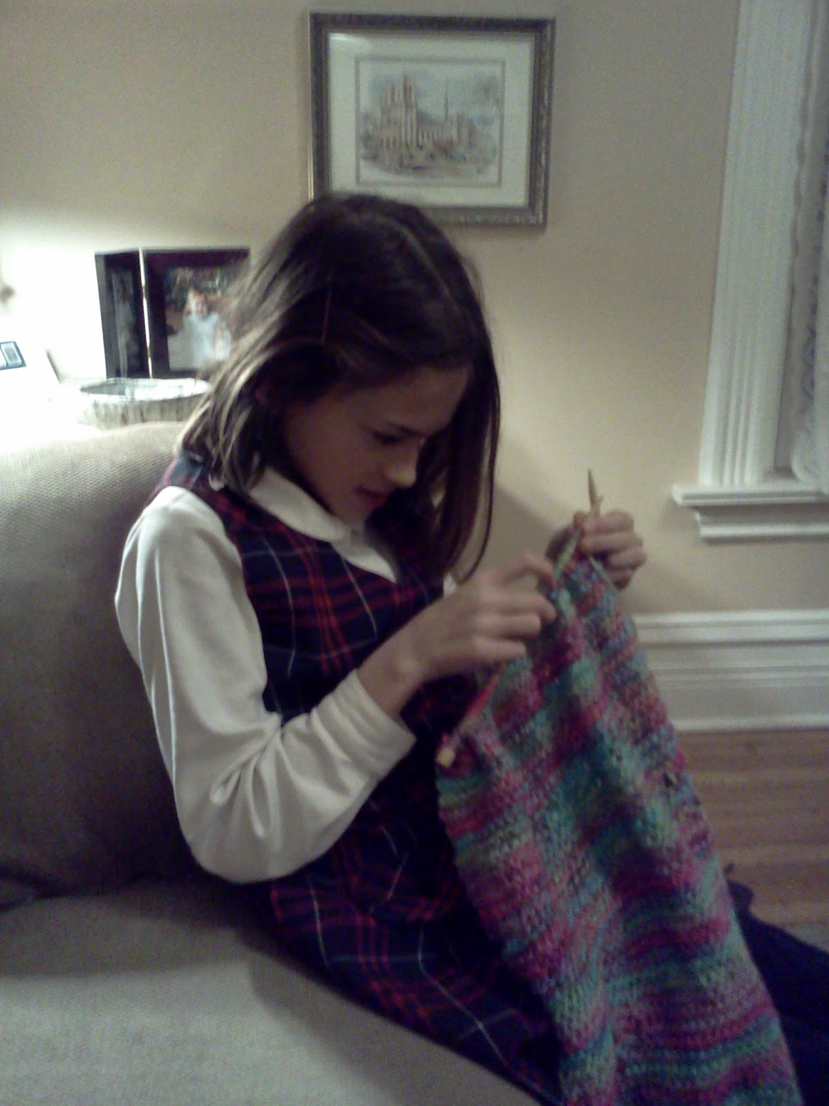 Working hard after school on knitting a scarf