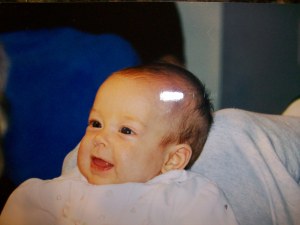 It’s so amazing to think a baby can be born this early and live! When she got home from the hospital, she looked more like this below — you can see her head had been often shaved for IVs and her muscles were very tight (the clinched fists). She was on an apnea monitor for a while, so you see the cord. And she was still pretty tiny, maybe 5 pounds here.